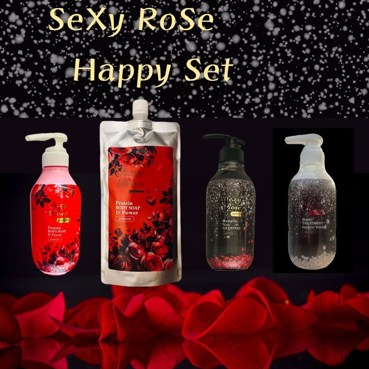 あなたの魅力を引き出す、Sexy Rose(高貴な魅惑の薔薇の香り)HappySetが登場!この特別なセットには、ボディソープ本体と詰め替え、ヘマチンBLACKシャンプー、さらにリペアトリートメントが含まれています。全身からいい女のオーラを漂わせるための究極のアイテムです。