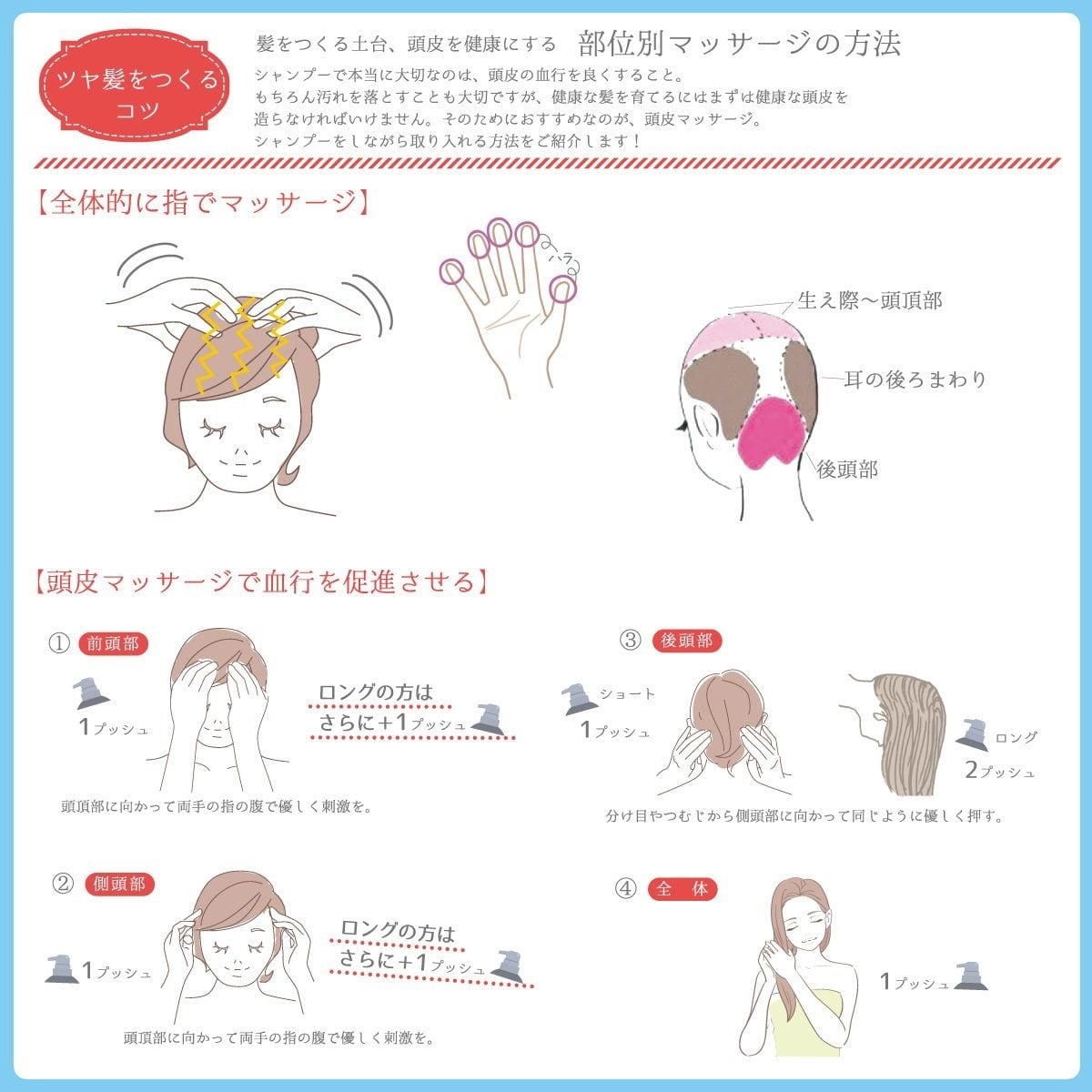 最初に余洗いをし十分にを手に取り、前頭部・側頭部・後頭部・頭頂部をそれぞれ30秒程マッサージしフェイスリフトアップ効果も楽しみながら、髪や頭皮をマッサージするように洗い、5分程度髪と頭皮に馴染ませて最後によくすすいでください。毎日のシャンプーとしてお使いいただけます。
