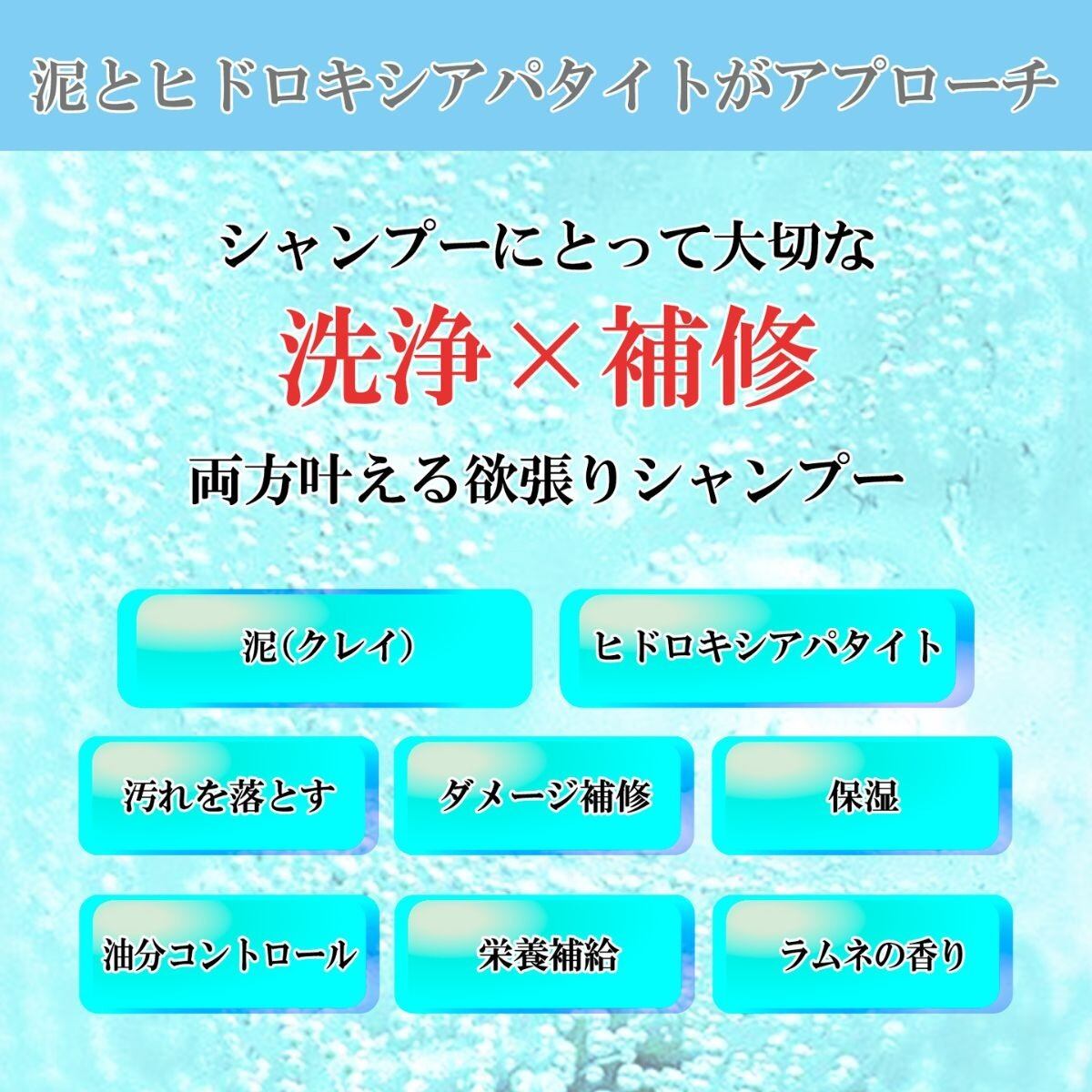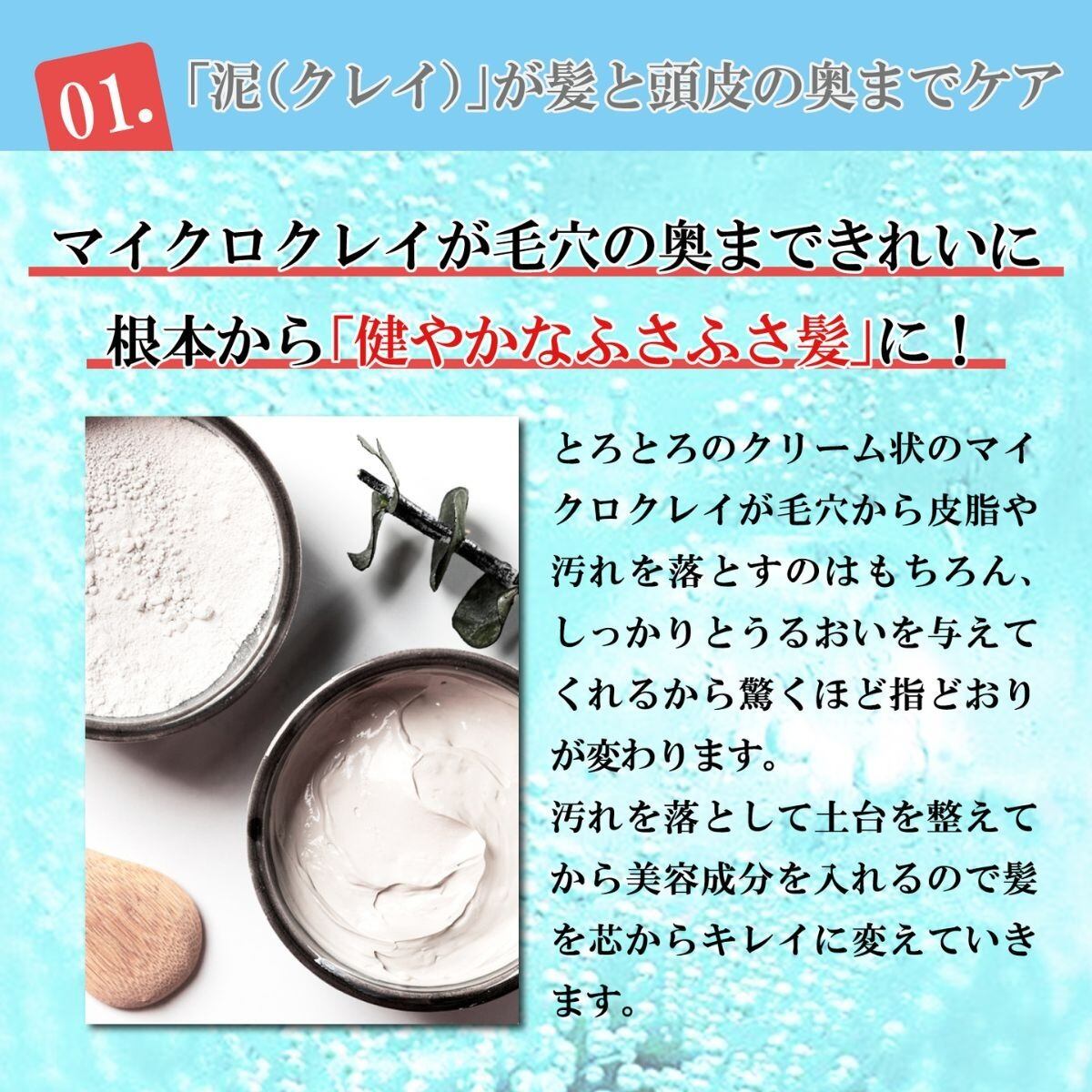 このシャンプーは、クレイ成分を贅沢に配合し、髪や頭皮をやさしく洗い上げます。ノンシリコン処方で、敏感肌の方や髪に優しい製品を求める方にも安心してご使用いただけます。さらには、髪の潤いをしっかりと保ち、しっとりとした仕上がりを実現します。